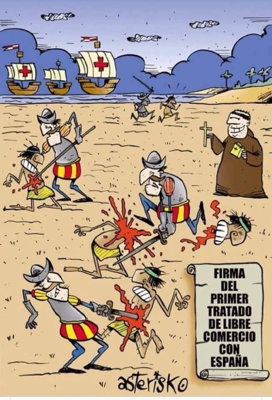 «Сегодня 12 октября, особая годовщина в истории человечества и западной цивилизации. Именно открытие и грабеж американского континента сделал возможным для европейских империй их быструю индустриализацию и переход к капитализму. Империи никогда не перестали быть таковыми, со временем они просто научились защищать свои интересы эффективнее и гибриднее, а место золота и серебра в шкале приоритетов заняли нефть и литий. Вторжения конкистадоров и морской пехоты в непослушные страны были успешно заменены финансированием оппозиционной прессы и введением экономических санкций. Газеты стали эффективнее танков, а телеэкраны – разрушительнее ракет.